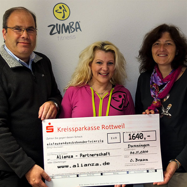 Caroline Braun (Mitte) überreicht den Erlös der Zumba-Benefizveranstaltung an Frank Friedrich (links) und Dagmar Braun (rechts) der Alianza-Partnerschaft mit Chachapoyas/Peru.
