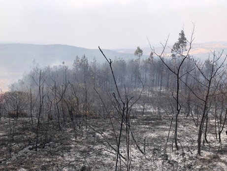 Wie ich später erfuhr, hat gegen 10 Uhr ein Nachbar ein gerodetes Stück in Brand gesetzt. Das Feuer geriet sofort außer Kontrolle. Selbst an der etwa 4m breiten Straße konnten die hinzueilenden Nachbarn ein Übergreifen nicht verhindern. Der starke Wind trieb brennende Grasbüschel vor sich her. Als ich ankam, war bereits ein guter Teil meiner 3ha in Flammen, undenkbar, sich da hineinzuwagen. Immer mehr Leute kamen, aber mit 2 Gartenschläuchen und ein paar Eimern und wenig Wasserdruck konnten wir ein Übergreifen auf den Wald meines Nachbarn nicht verhindern. Mit knapper Not konnten wir die Flammen wenige Meter von seinem Haus verhindern. Inzwischen waren auch Zivilschutz und Polizei sowie zahlreiche Freiwillige eingetroffen, so dass die Flammen eingedämmt und ein Wiederanfachen schon gelöschter Bereich verhindert werden konnte. Die Hilflosigkeit, zuschauen zu müssen, wie die Arbeit von 15 Jahren in weniger als einer Stunde zunichte gemacht wurde und die Wut auf den Brandstifter sind nicht beschreibbar.